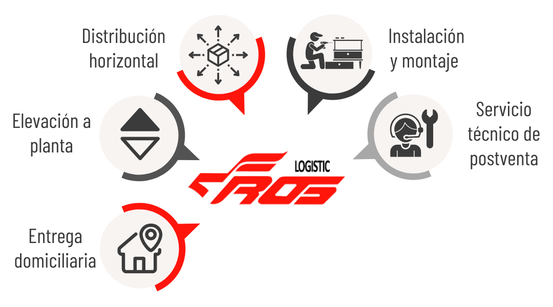 Almacenaje - Entrega domiciliaria - Elevación a planta - Distribución horizontal - Instalación y montaje- Servicio técnico postventa
